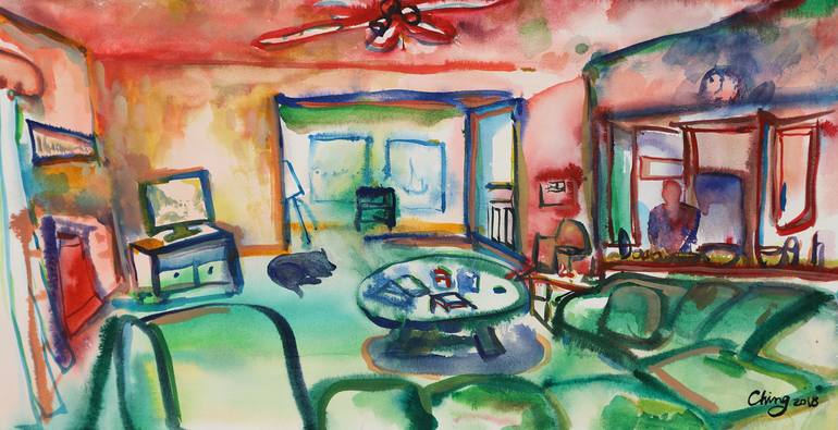 It is a piece of plein air work. The fire place was on, the TV was playing, and the clock was ticking. The man had finished the work of the day and was getting the dinner ready, and dog was just relaxing on the carpet floor. The wind was whistling in the forest and the seals by the sea were making v...