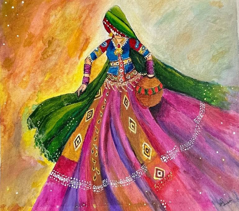 In this lively artwork, a Rajasthani woman gracefully engages in the enchanting Chari dance, dance style that includes balancing a pot with her hands and head. The Chari dance, steeped in Rajasthani tradition, exuberantly celebrates the seemingly mundane yet crucial act of water-carrying. Emerging f...