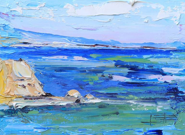 A textured deep impasto palette knife painting in oil by an award winning San Francisco Bay artist, featuring Pleasure Point, a popular surf destination near Santa Cruz, California. *2020 painting *9x12x.02” on archival cotton canvas panel *Signed front and back *Award winning artist *Ready ...