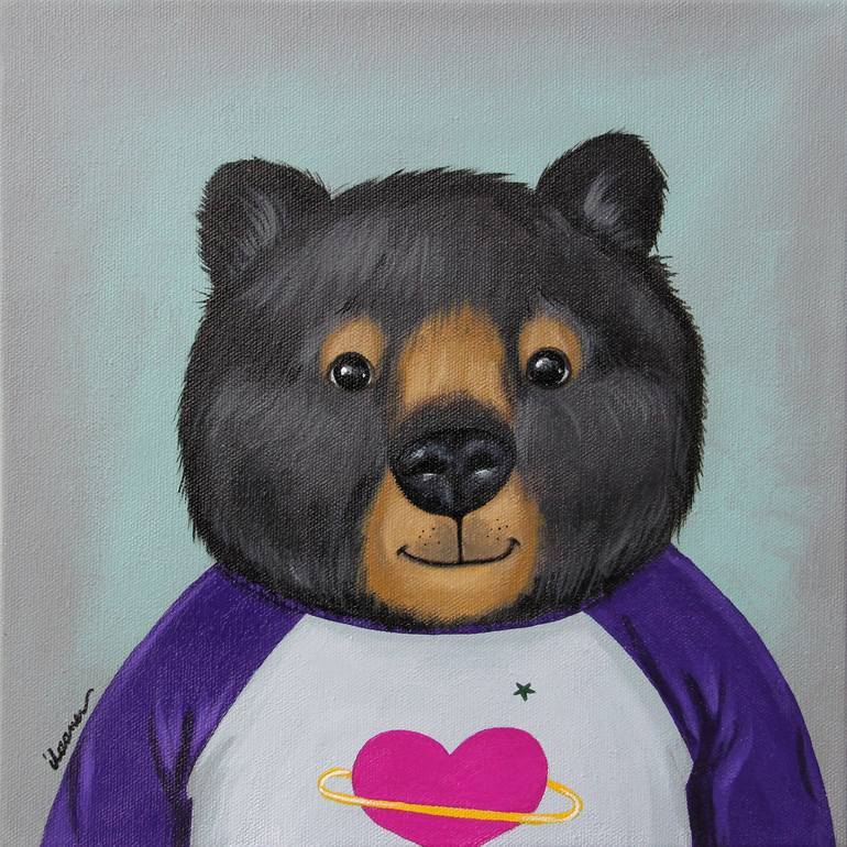 2023 / Acrylic, graphite and pigments on canvas. Illustrative portrait of a black bear wearing a purple baseball t-shirt with a graphic heart and stars on it. This painting is part of my series "Childhood Memories" that honors the characters that inspired me as a kid.