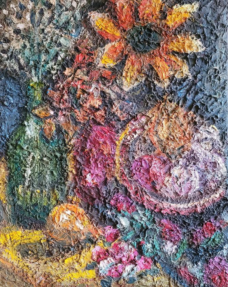 I painted this still life using an unusual technique - painting on a fuse. First, I created a convex texture from the remains of oil paint. When this layer was completely dry, I painted a still life on it. The result is the artwork that can only be seen from afar; up close it looks like a textured m...