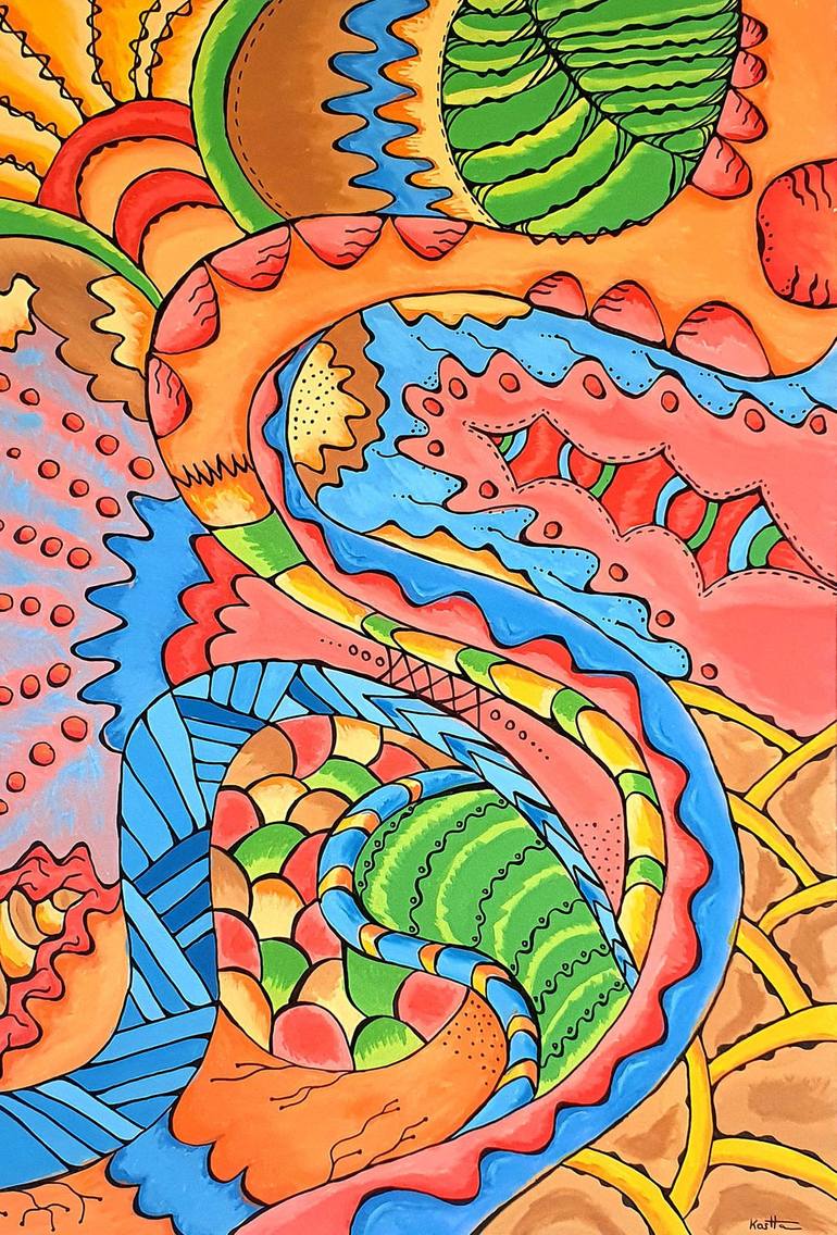 Dennis Kostta was born in 1977 in the city of São Paulo and grew up in Diadema city (Brazil), where he started to make abstract drawings similar to his current art when he was still a teenager, always working in pencil or pen on paper. However, it was only after 44 years that these images gained more life, new forms and many colours in his paintings with acrylic paint on canvas. "I paint new worlds in an abstract way. In my point of view, these places are full of life, peace and harmony. I work with strong colours that represent the vitality of the emotions I'm feeling when I paint. When I'm working on my art, my state of mind is at its best, there's no room for doubt, fear or bad feelings, I'm just flowing with the shapes and colours. My work is part of my spiritual journey, and the more I dive into it, the less I know. I have an open mind, where anything is possible and no one knows the real truth of what happens to us after this brief stint on our planet. In my view. spirituality is something individual, something we look for in ourselves, and the more we look for answers, the more questions arise. The viewer has the freedom to explore the traces, colours and movements of my canvas from their life experience, but, deep down, I as an artist hope that within this personal interpretation, emotions connected to beauty and positivity arise."