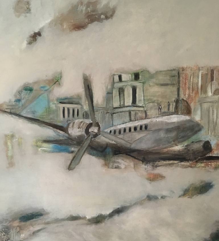 This painting is part of a series inspired by a photograph of Anselm Kiefer's broken plane. This war machine is now immobile and impotent, a novel Ozymandias, or a god in ruins. I made several versions of it, this large one and several small ones that I painted on found boards, with interesting cut...