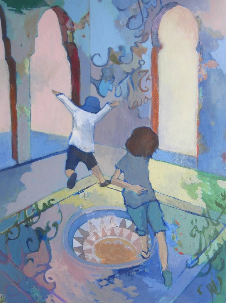 Taking my 2 boys to Morocco on the footsteps of my brother and i when we were children was the starting point of this piece. As i worked on the painting and developed a visual conversation between the blocks of colour, the lightness, darkness and the morphing shapes, a narrative began to establish i...