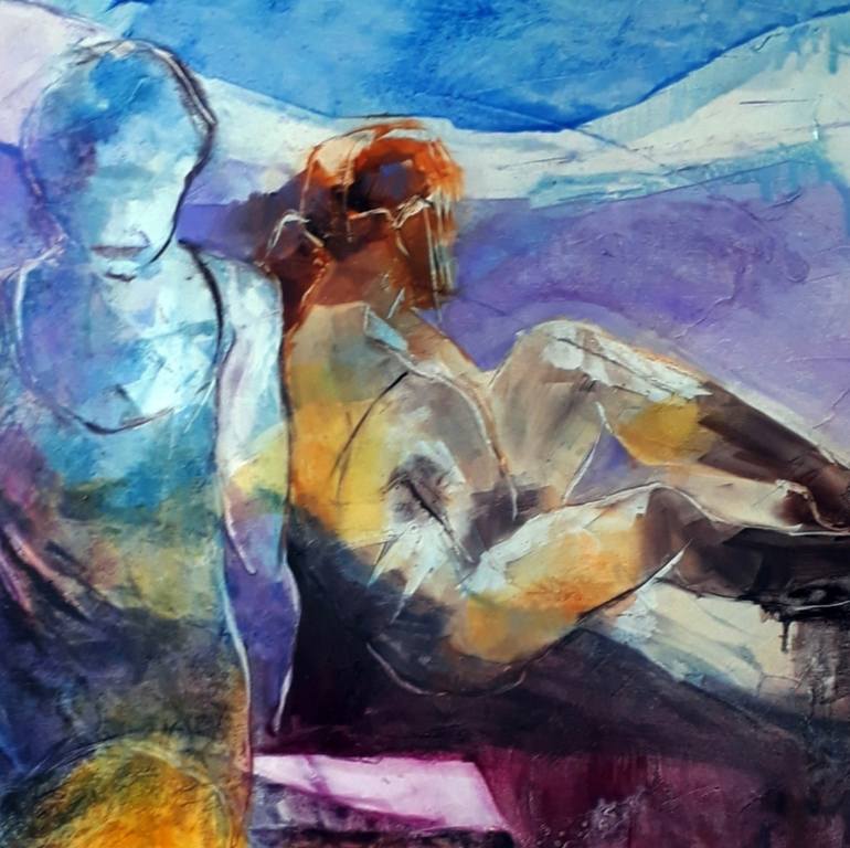 c'est l'été... le personnage rêve à des vacances passées... à son enfance auprès de sa mère... les couleurs de la toiles évoquent la nostalgie de ses moments toile enduite peinte avec des pigments dilués.... profil de la toile recouverte de tissu toilé noir... certificat d'authenticité I-CAC