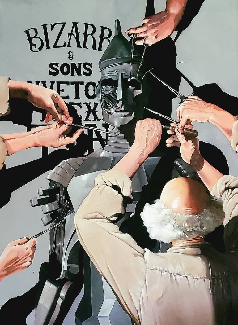 This portrait draws its inspiration from medical anatomy studies, drawings and illustrations from turn of the century medical books and encyclopedias, as well as, medical figurines and and human musculature models. The doctors/tinkers/mechanics building the Tin Man are reminiscent of Renaissance pai...