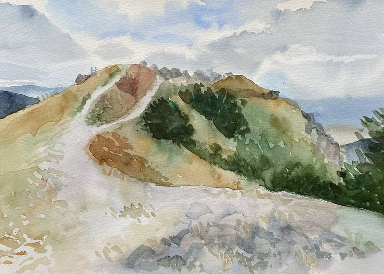 This watercolor painting beautifully captures the serene charm of a mountain trail, where rugged slopes in earthy greens and browns meet the vast, open sky. The loose, expressive brushstrokes bring a sense of movement and depth, transporting the viewer to a tranquil alpine setting. Perfect for natur...