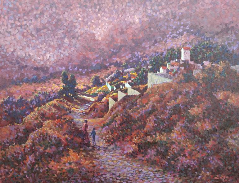 An oil painting on cardboard pressed panel. An imaginary panorama of a warm sunset, with a path that leads into the small town strongly illuminated by the sun. The treatment has been by means of short brushstrokes with intense colors, which reinforce the luminosity of the work.