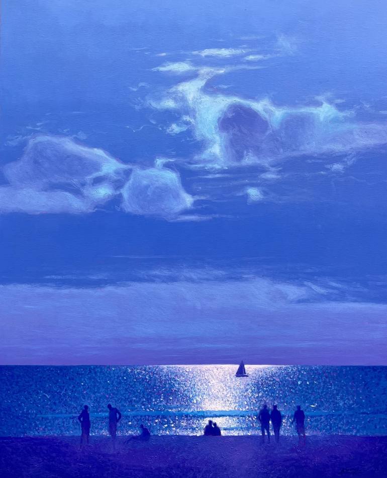 This artwork endeavors to seize the serene and intimate connection between the sea and the celestial realm. The brushstrokes skillfully depict the rhythmic dance of the waves, and the interplay of light mirrors the peaceful moments shared by silhouettes against the backdrop of gleaming water. It en...