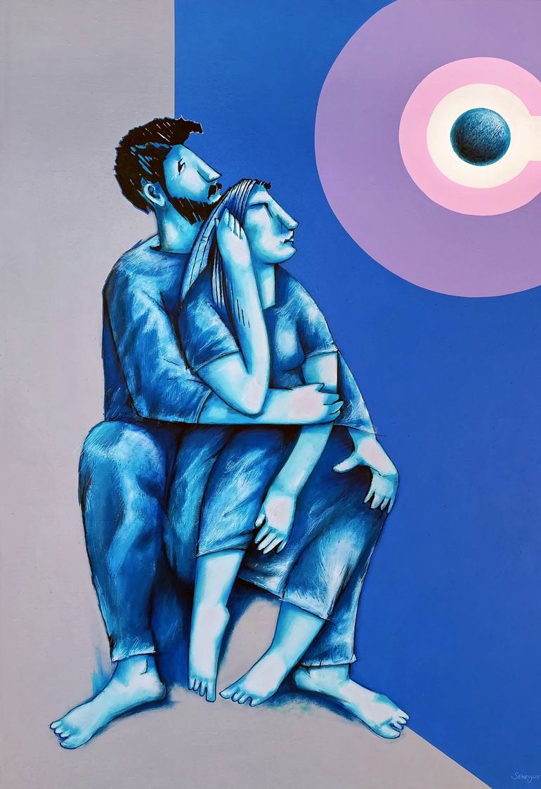A silence of the infinity. 2024. Acrylic and oil on canvas. 140 x 95 cm. High grade Acrylic and Oil on quality cotton canvas (340g). 140 x 95 cm. All the paintings finished with a matt varnish including the sides. Large minimalistic figurative painting. The figures, depicted in a minimalist style. ...