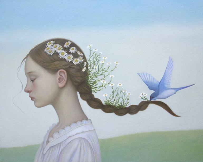 This artwork, part of the "Wind Snow Flower Moon" series, portrays a moment where the magic of nature tenderly interacts with the innocence of youth. A girl in a tranquil state is joined by a little bird, which appears to be adorning her braid with daisies. This scene is a serene and ethereal repres...