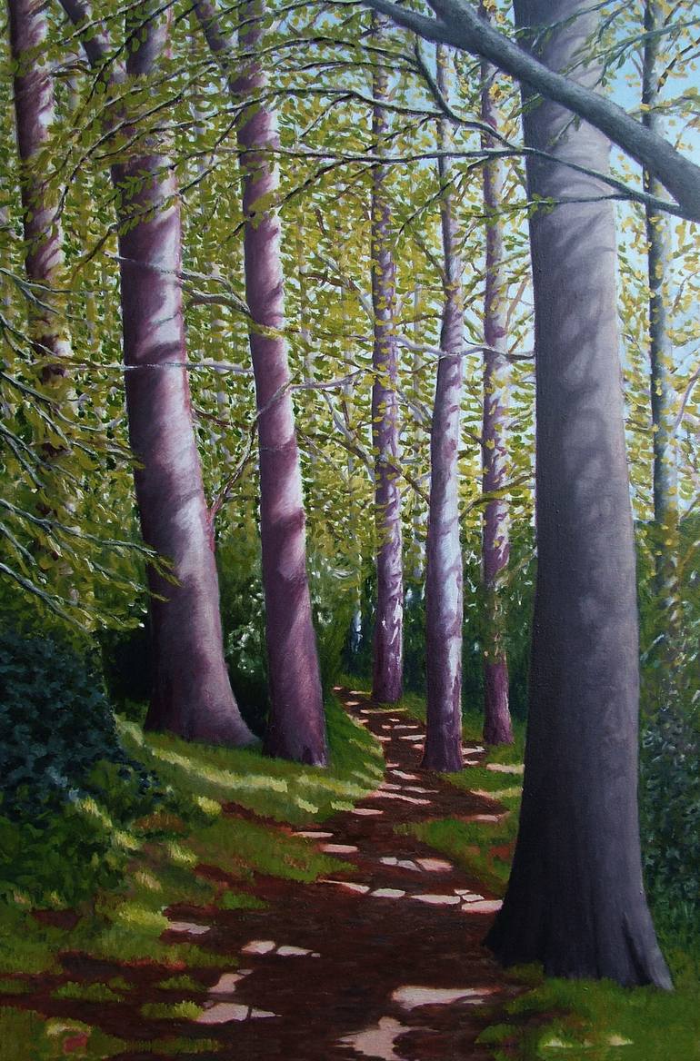 This is the path on the hill above my house in Bridport, West Dorset. I wanted to capture the impressionist effect of dappled light on the path. I started the painting 'en plein air' (on location) and then worked on it in my studio before I returned it to the location to finish it. With all of my la...