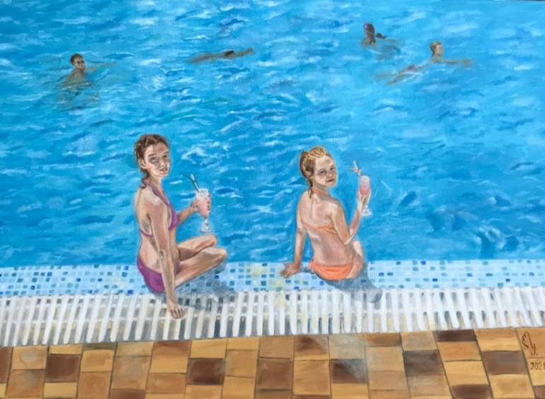 This is one of the hot summer day where people are relaxing in pool and drink cold cocktails. Finished with varnish. Stretched and ready to hang. All my paintings are unique and original.