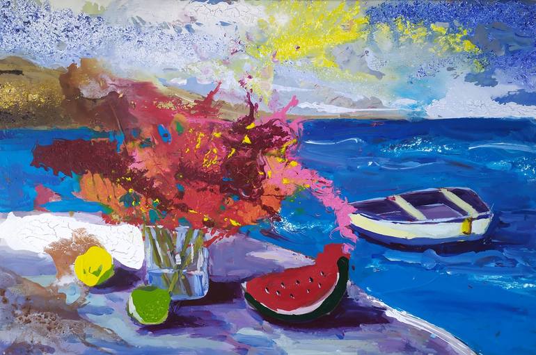 A sunny day in Crete - τhe painting presents a Greek landscape in a romantic way. The feeling you get from the Greek islands, the endless sea and the blue sky. The painting calms you down and takes you on a journey.