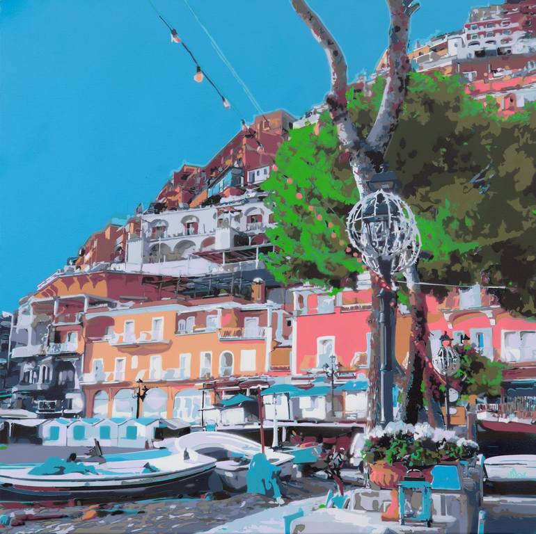 "A Taste of Positano" offers a realistic glimpse into the renowned Italian coastal town, celebrated for its picturesque scenery and vibrant atmosphere. The spray paint on canvas technique vividly brings to life the multicolored houses cascading down the hillside. The painting captures the bustling y...