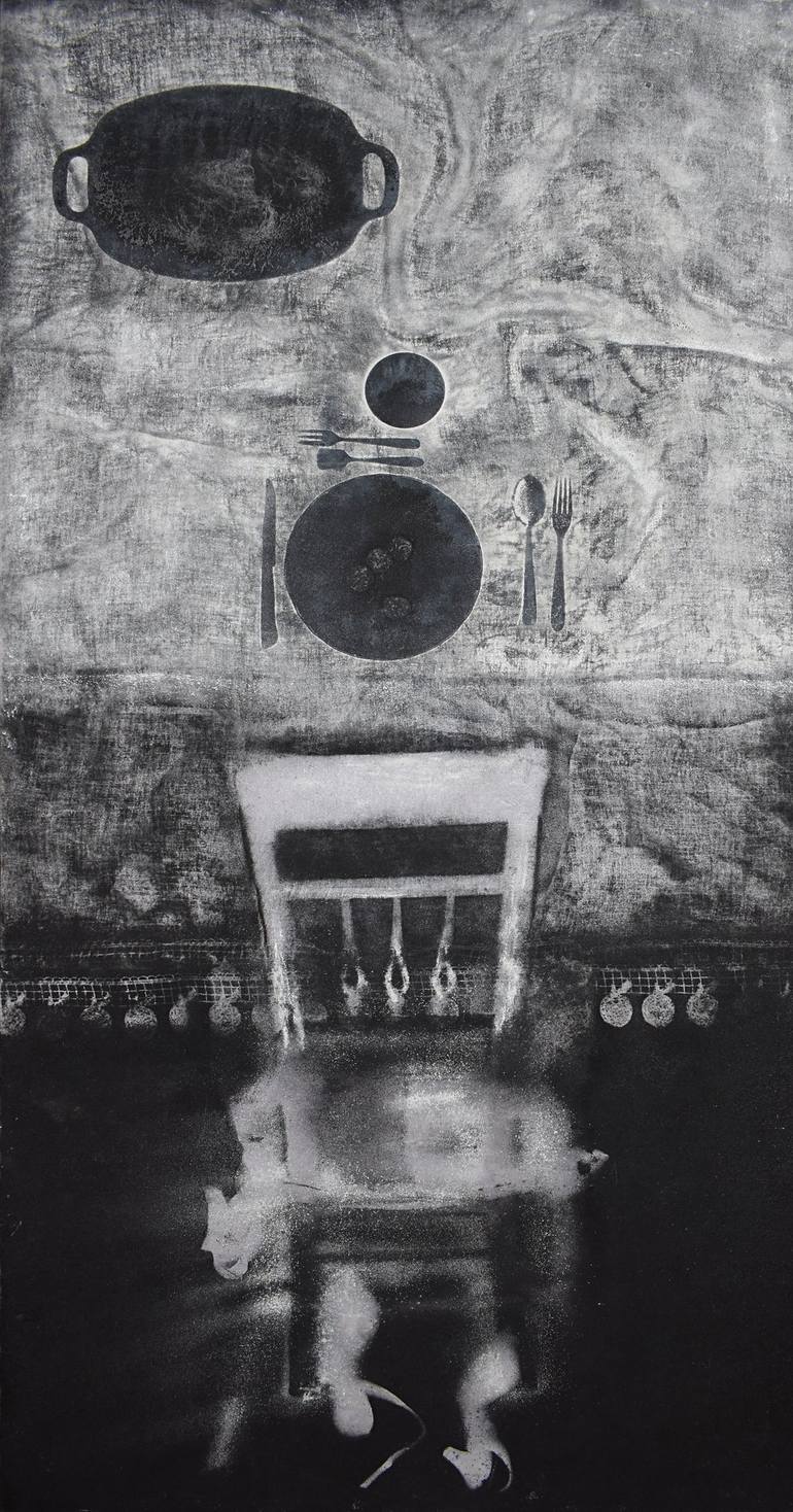 "A tavola con la solitudine" is a large original painting that employs a unique technique, setting it apart from traditional approaches. The artist's method involves layering powdered pigments onto a prepared surface, creating an image reminiscent of photographic impressions and the experimental tec...