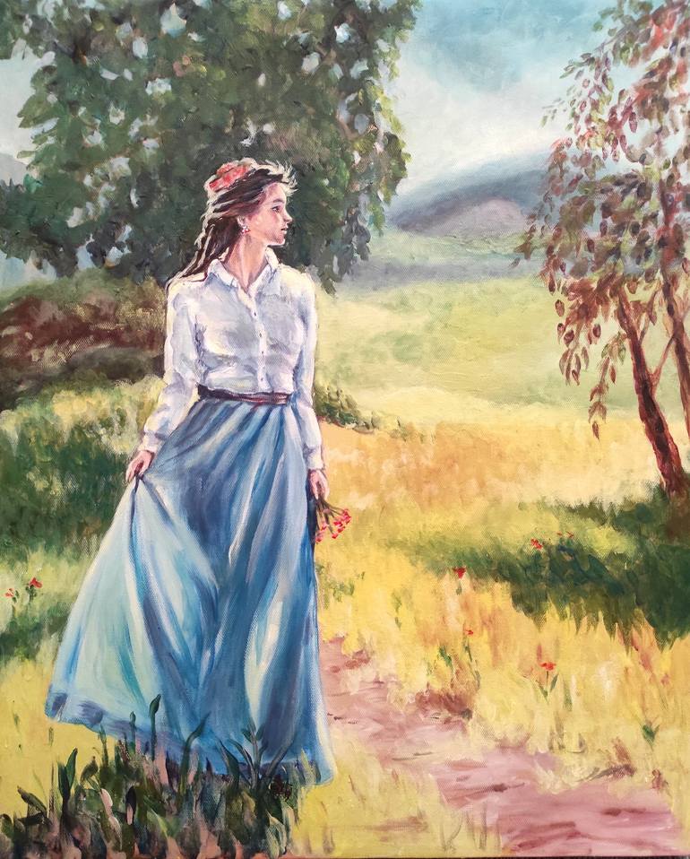 The picture is painted in pleasant colors, acrylic paints on canvas. a girl is walking home on the road. Her thoughts are in order for the first time, she feels freedom and joy.