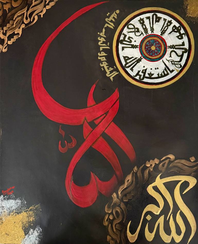 ALLAH name written in this luxurious beauty in the middle gives majestic vibes. This is an original painting by Aqsa Raja a well known artist from Pakistan. One of a kind original artwork. The kufic script written gives a unique look to the painting along with the other scripts. The painting is ava...