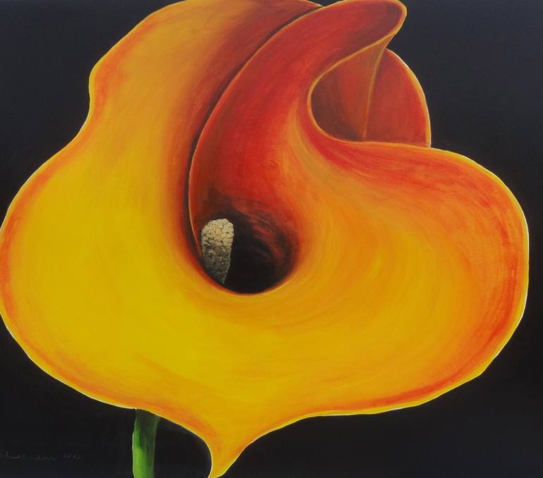 A large golden yellow cala lily, with the focus on its ornate looking center spathe. I find myself drawn to the deeper part of a flower, and the calas are the most beautiful shape almost inviting to peep inside its depths ! Perhaps there exists a spiritual aspect to this depth that draws one in. Sho...