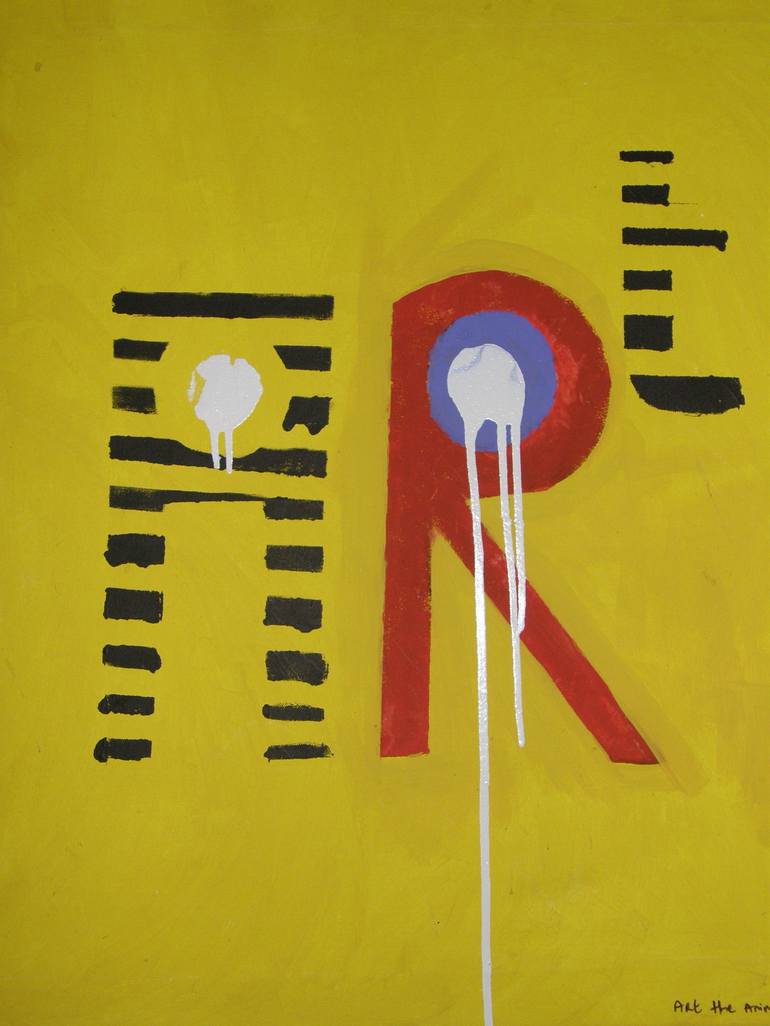 I have painted the word art to look like a four legged animal. hence the title "art the animal" onto canvas. the silver drip represents targets and mistakes.I painted over a hand made paper stencil. The black and yellow is the colors of bees that have a sting in their tail.