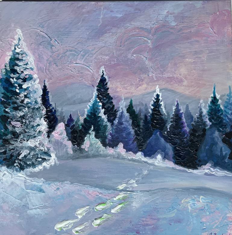 AUSTRIAN WINTER -landscape of the beautiful winter view of Austria. Gentle pastel clouds, trees covered with snow and traces of snow in the foreground. Size: 50W x 50 H cm ( or 19.6 x 19.6 inches ) Acrylic painting on canvas. Covered with good layer of varnish. Unframed. READY TO HANG! Painted on...