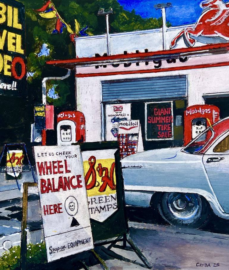 This original painting, "AUTOMOBILE LAND", captures a vibrant gas station scene reminiscent of 1960s USA. The artist was initially drawn to the striking colors of a vintage photograph, which served as the inspiration for this figurative piece. The acrylic paint on paper brings the scene to life wit...