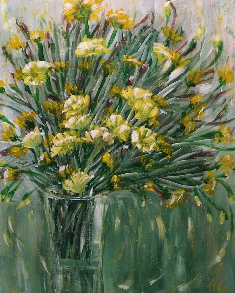 Awakening Beauty - A Vase Of Dandelions By HSIN LIN 30/11/2018 40.6 x 50.8 X 1.5 cm Acrylic on Acid free Gesso primed Canvas D-rings and wire attached at the back. Ready to hang Side panel painted to match : Light Green Affirmation : Think outside of the box, live beautiful inside of the vas...