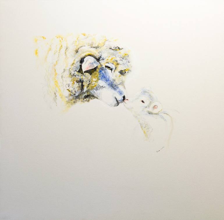 This ewe did not have enough milk to feed her lamb when it was born, resulting in her baby having to be bottle fed by caring farmers but the bond between mother and baby remained strong. Having observed this touching moment between them I was inspired by their loving nose touching, painting it in a ...