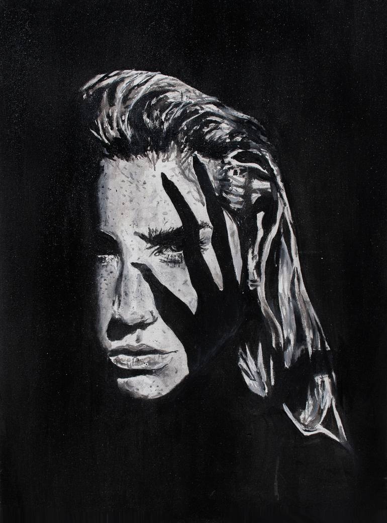 Female portrait painted in acrylic on canvas. The sunlight case shadow creates a contrasting hand shadow on the subjects face - skewing the hands dimensions to appear almost alien.
