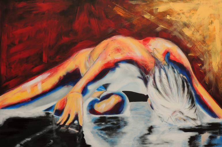 "Absolucion" by David Scholes presents a powerful tableau of introspection and contemplation, encapsulated in the essence of profound self-reflection. The canvas portrays a woman, positioned on her knees and side, engaged in a moment of deep introspection. Her posture suggests a sense of surrender a...