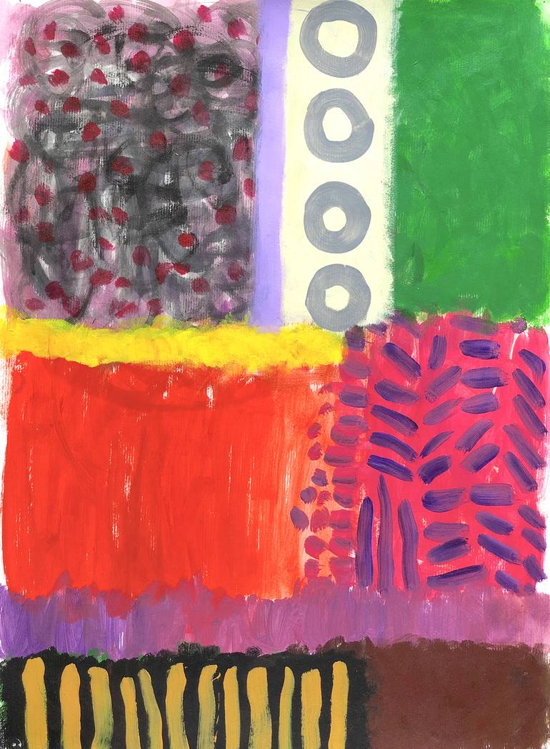 A lot of dots and circles, a few large color blocks, they form a strange abstract figure.