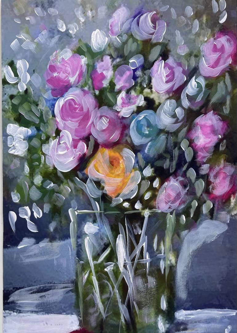 Acrylic on 310 gsm cotton rag paper. Unframed. Colourful floral art. Vertical artwork. Painted with texture, colourful flowers in glass vase. Painted with quality Acrylic paint. Ships I. a tube for protection.
