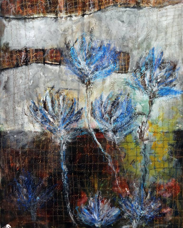 This is a striking mixed media painting featuring abstract interpretations of blue thistle flowers. The artwork employs a variety of textures and layers to create depth and visual intrigue. The background is a dynamic blend of earthy tones, including shades of brown, green, and yellow, interwoven wi...