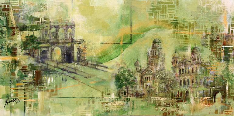 In this cityscape on stretched canvas, delicate rendering melds with abstract symbolism, as old Bombay's past is etched beneath evolving blocks of buildings. The soothing green palette and a golden pathway embody the ever-changing urban narrative, where memories are buried and replaced by the relent...