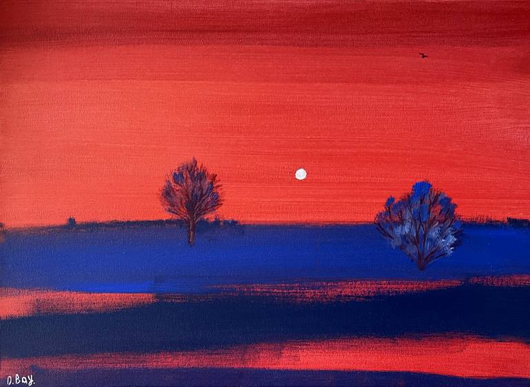 Abstract Landscape Painting Red Blue Contemporary Art "Winter" This is the first painting in my series "Memories in Red". It depicts a frosty winter evening with two trees lightly dusted in snow, the soft glow of the winter sun, and a bird soaring in the sky. This scene reflects my memories of Ukra...