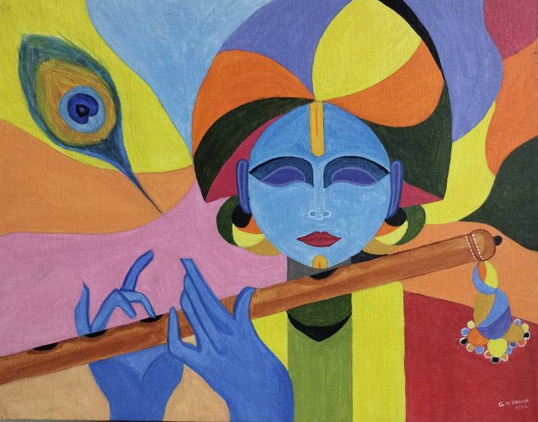 This abstract painting of Lord Krishna captures the divine essence and mysticism of the beloved deity through vibrant, swirling colors and fluid shapes. The composition evokes a sense of movement, as if Krishna is playing his iconic flute, the music transcending the boundaries of the physical world....