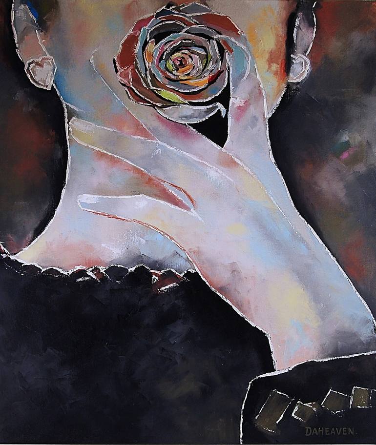 Abstract Portrait of Woman with Rose - Palette Knife Oil Painting. 60X70cm, oil on canvas. Immerse yourself in the enchantment of this captivating abstract portrait where the mystery and emotion of a woman holding a rose in her mouth come to life through the dynamic brushstrokes of a palette knife. ...