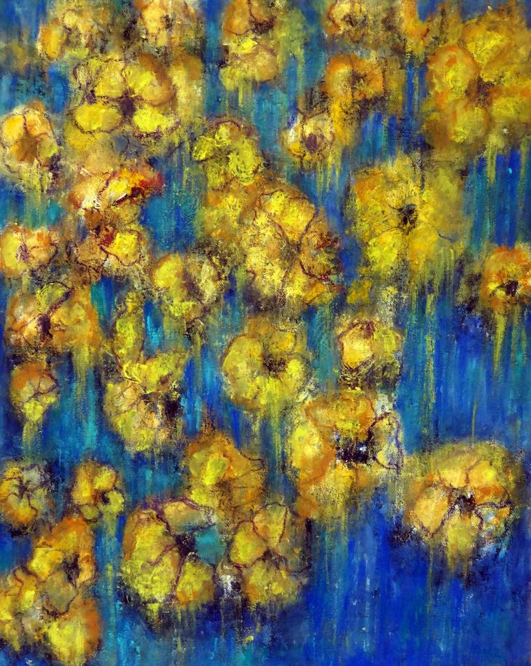 This artwork, titled "Abstract Yellow Flowers Mixed Media Painting," is a vibrant and dynamic piece that captures the essence of yellow flowers in an abstract style. The composition is dominated by vivid yellow flowers that seem to burst forth energetically from the canvas. These flowers are set aga...