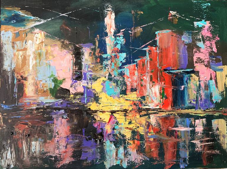 Abstract city. Cityscape. Original impasto, Palette knife oil painting. This is one of a kind original oil painting. ►100% handmade oil painting on MDF board ►Dimensions: 40x30cm.(unframed) ►Impasto technique with vivid strokes and textured surface ►Materials: professional quality oil paint, mdf boa...