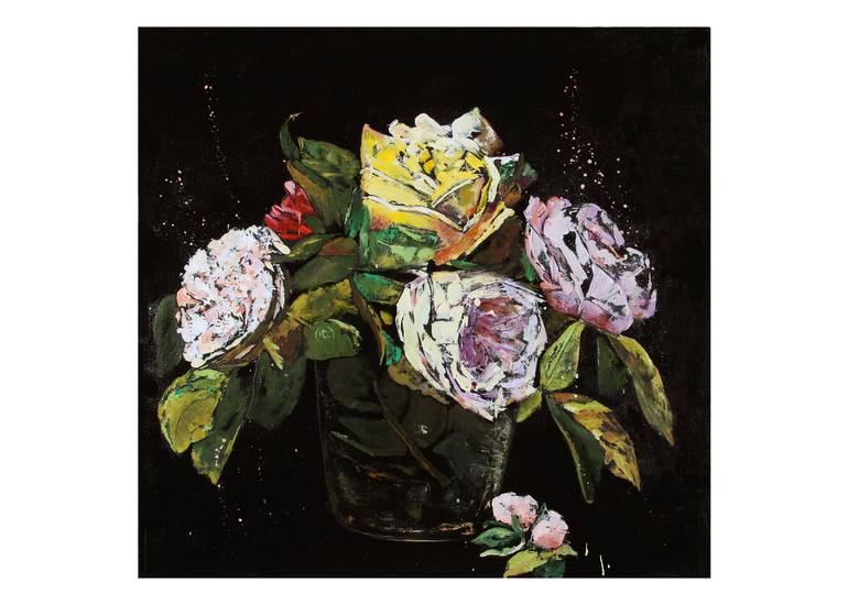 This was one of the first florals I did this past summer in appreciation of the profusion of flowers I saw everywhere around my neighborhood. Clearly this work is modeled after the Dutch masters of floral painting, although I doubt they would have appreciated the Jackson Pollack touches. Only pallet...