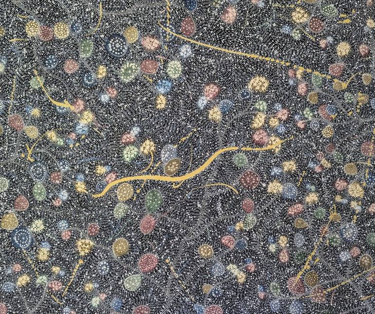 In a complex merging of opposites – day and night, dreams and reality, void and plentiful of life – Abyssal Arabesques looks towards the darkness and the inwards journeys of rebirth. This work is a large canvas covered in an all over style of iridescent mark making inspired by the underwater reef li...