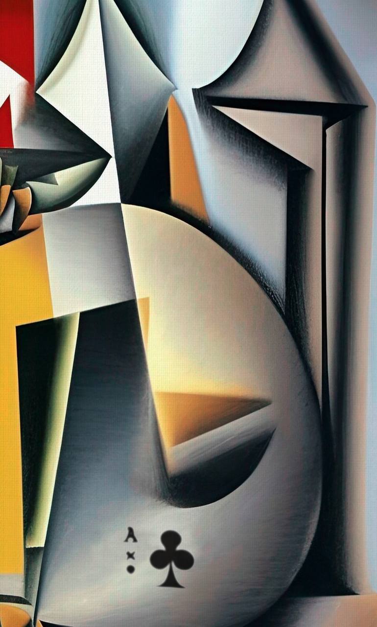 Experience the fusion of abstraction and strategy with "Ace of Shadows: A Cubist Reflection on Poker". This captivating oil painting on canvas masterfully combines the intricate geometry of cubism with the high-stakes world of poker. The artist's deliberate use of angular forms and contrasting shado...