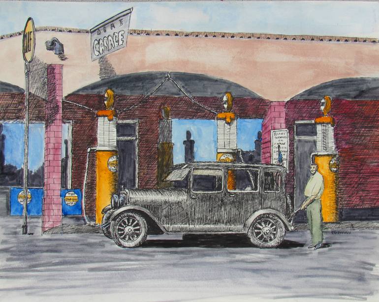 This is my grandfather, Oran Tinsley, gassing up a 1929 Essex at his Mason, Texas gas station which he ran for over 50 years. The drawing captures the spirit of the self-sufficient young man of the era of the Great Depression. The painting was based on a fuzzy photograph. The pump colors are accura...
