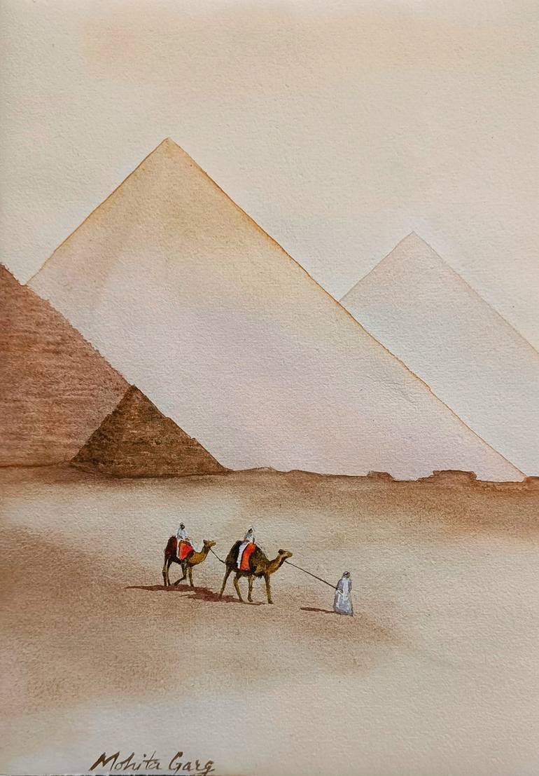 A journey through time and space, this original watercolor painting captures the majesty of the Great Pyramids of Giza, bathed in warm, earthy hues. Two travelers on camels, led by a guide, move through the endless desert, evoking themes of solitude, adventure, and timeless exploration. With a mini...