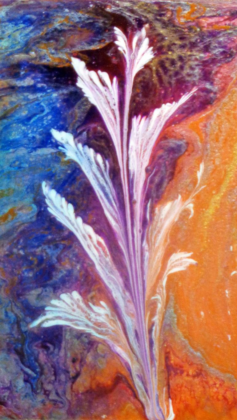 This is acrylic free flow on a wood panel with one white flower. It ships in a box, unframed.