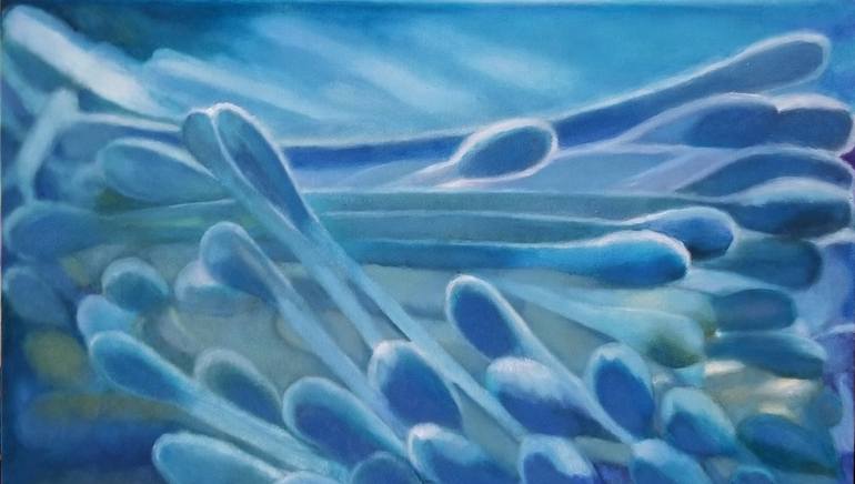 a long unnaturally enlarged rendition of Q-tips as part of my still life series with a relation to my outdoor still life pieces through format and size