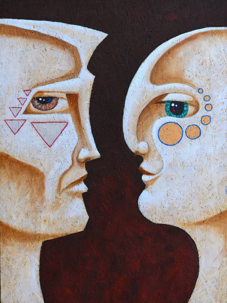 Two creations - so similar and yet so different, yet fitting together. Maybe because there is a part of Eve inside Adam as much as vice versa. This artwork is painted on a pressed wood board, giving it a special and added natural texture.
