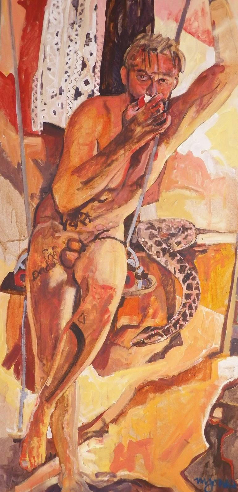 "Adam" is an original 24 x 48"" acrylic painting by Micheal W. Jones. This lovely male nude painting is one of the artist's "Gods and Fools" portfolio, depicting Adam, the ultimate fool. It was created from a live model, using the finest pigments on gallery wrapped acid-free canvas, and will be sh...