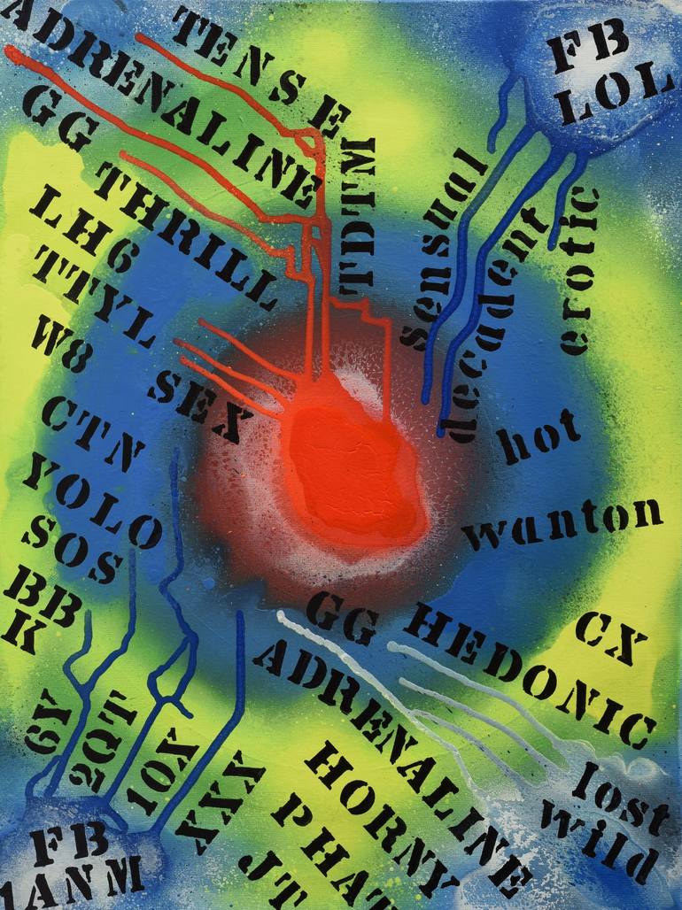 This painting is all about social media interactions.When we check in on social media,our organisms produce adrenaline and people could become addicted to surges of adrenaline.