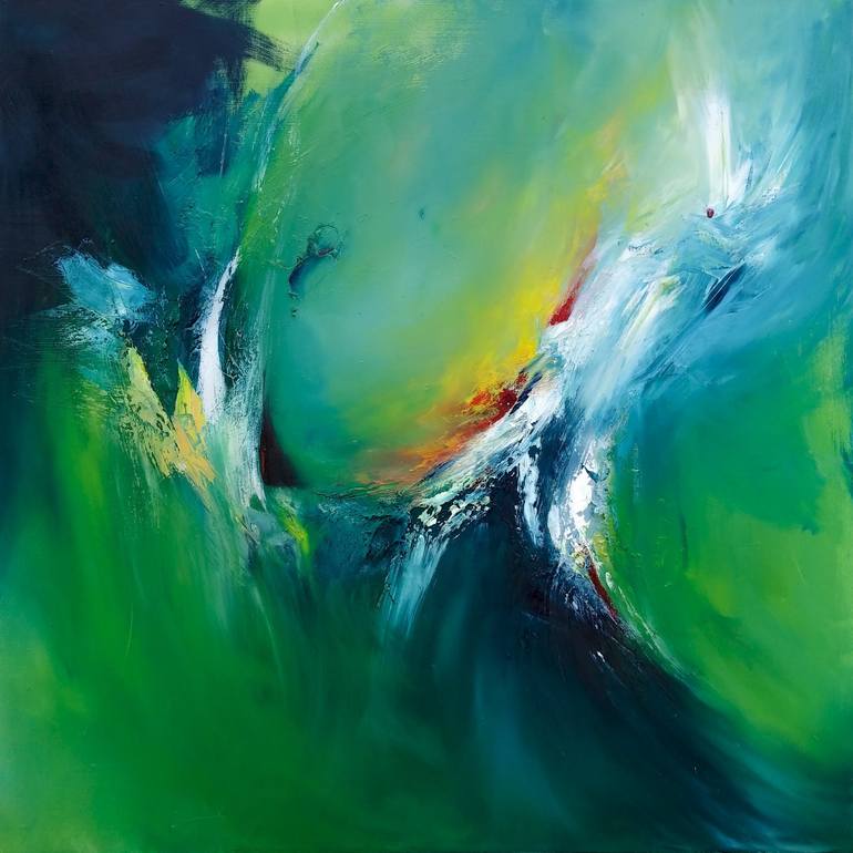 Her work focuses on the elements and natural phenomena created in a colourful movement. Her work expresses freedom and autonomy through the strong contrast of colours used. The use of oil paint creates depth, plunging the viewer into the painting, while embossed cement brings a unique sense of anchoring in her works.